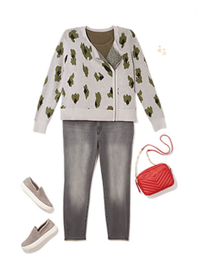 Instead of the expected solid plus size sweaters and blue jeans look, try grey jeans and graphic plus size cardigan sweaters for an unexpected-but-easy outfit.