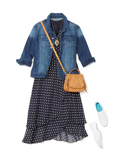 Yes, you can wear sneakers with a dress. Dress down this closet staple with a casual plus size dark denim jacket and a hands-free crossbody bag.