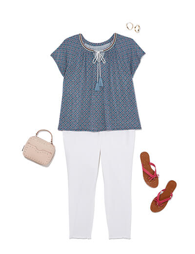 A comfy knit printed top with features like bows or ties elevates your everyday denim-and-sandals ensemble. White denim adds a layer of sophistication and can even be paired with more denim like a plus size denim jacket of a different wash or color.