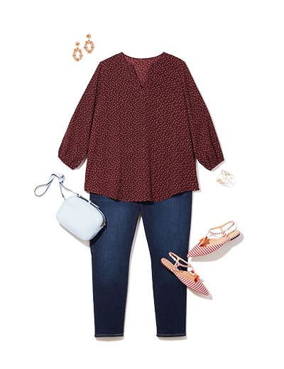 A tunic and cute plus size jeans can be chic when paired with flats that have a fun visual element, like a playful print or unique straps.