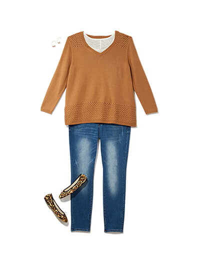 An oversized-sweater-and-jeans combo is always cozy and comfy, but a layering tee and printed flats make your outfit more thoughtful.
