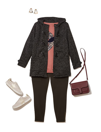 Comfy leggings or even some plus size capris jeans get a polished update when paired with a unique graphic sweater. Completed with a polished jacket and sneakers, this is the perfect weekend outfit.