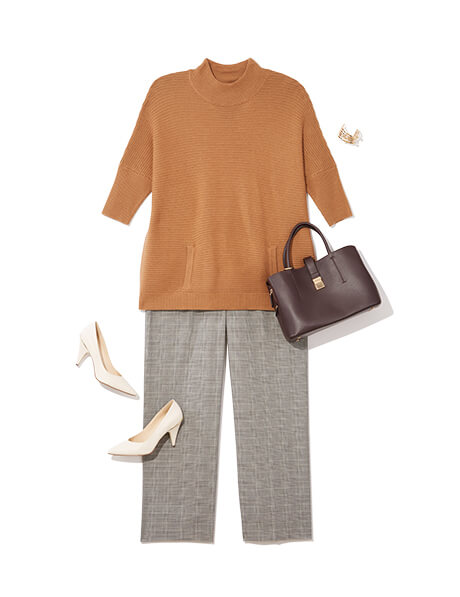 A neutral tan sweater and plaid wide-legged trousers are always in style and make for classic workwear—no matter the trends.