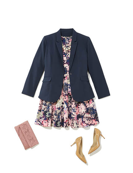 Your favorite dress becomes office appropriate with a classic navy blazer.