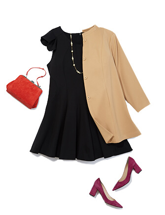 A collarless camel coat works year after year and pairs perfectly with any little black dress from your collection of ladies plus size dresses.
