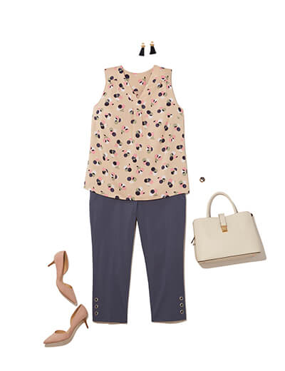 Trousers never go out of style, and neither do camel pumps. Mix in a printed tank and playful accessories to bring it into the now.