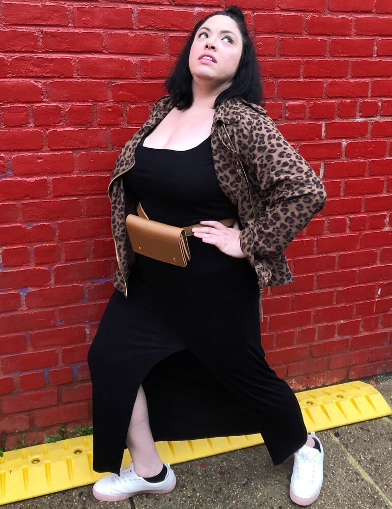 For Editorial Copywriter Sarah, a leopard moto jacket and fresh white kicks are the perfect way to transform a bodycon maxi for daytime.