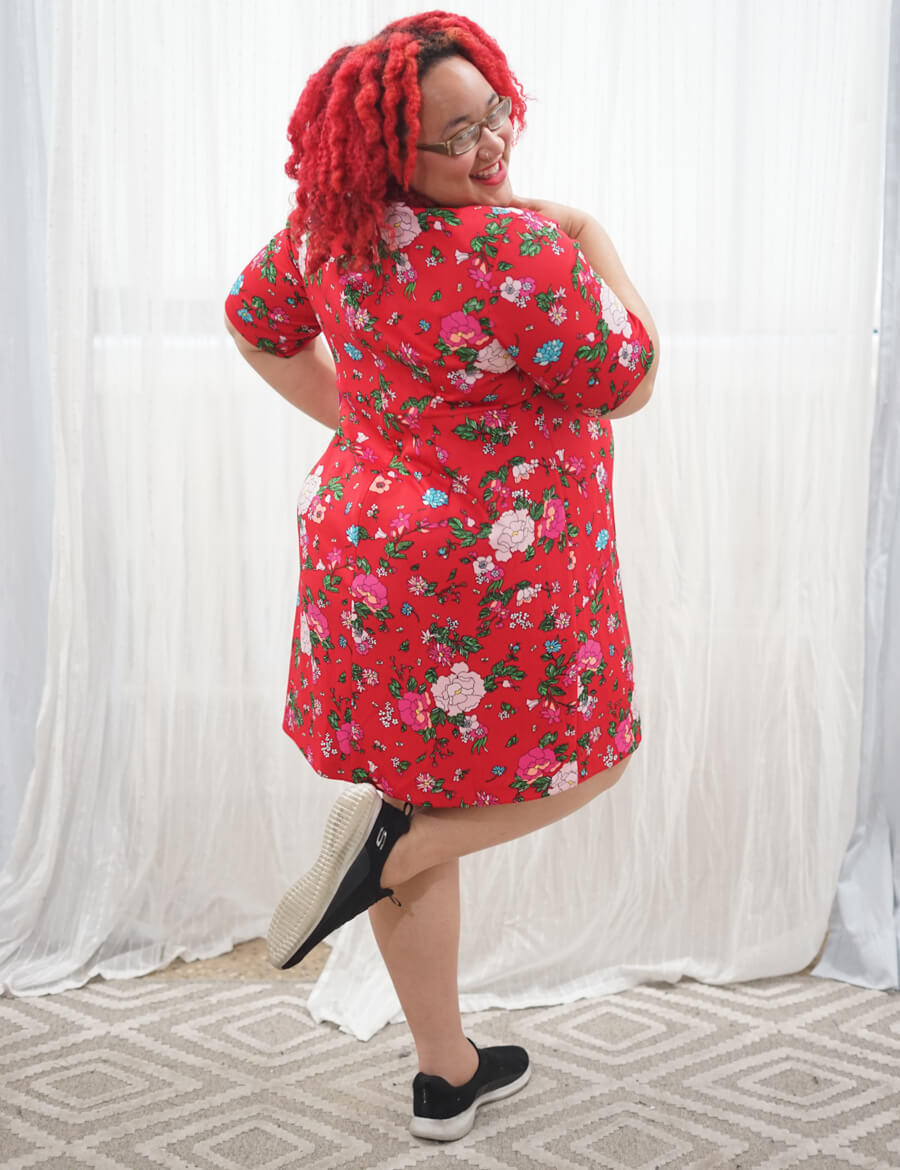 Take CX Associate Jonquel’s cue and balance the vibrancy of a red shift dress with simple black sneakers.