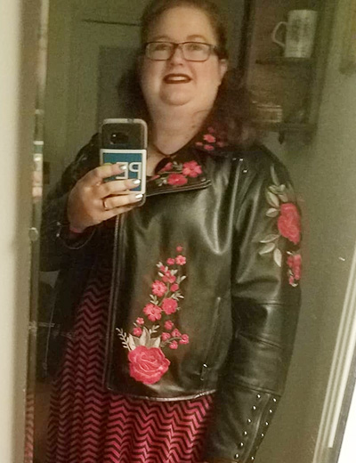 “My embroidered moto jacket with my red Dia dress. I feel confident, strong, and competent.”