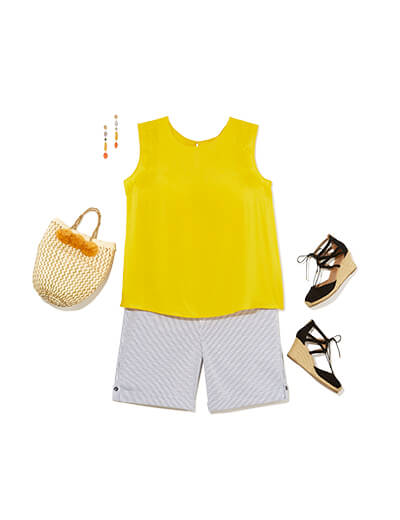 In the summer, give printed shorts their moment to shine and throw straw accessories into the mix. For fall, level up the simplicity of the top with a fun jacket, distressed denim, and sleek slingbacks.