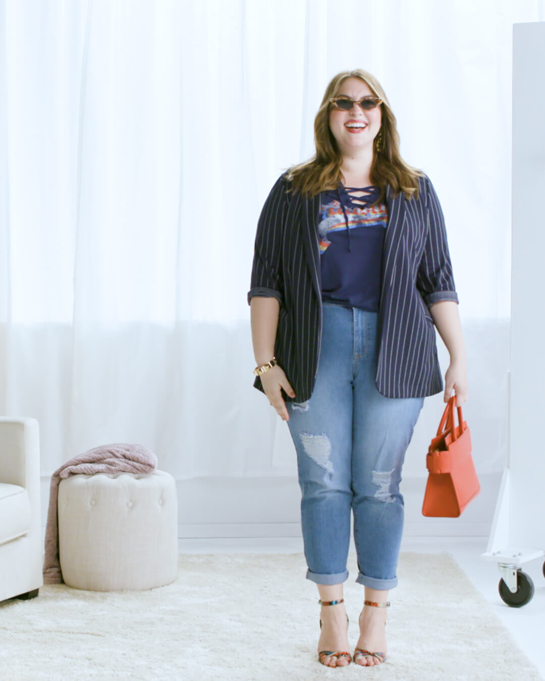 Go for I’m With the Band by wearing the blazer over a graphic tee and distressed denim. When every piece is in the same color family, anything goes! Pull together the whole look with printed sandals and a vibrant bag.
