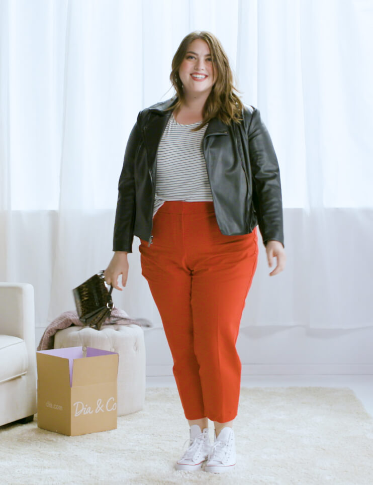 Going for Downtown Edge? Toughen up the pair with a faux-leather moto jacket, striped slouchy tee, and comfy sneakers—all in complementary colors. Then mix in another print with your accessories. Now you’re ready for a night out.