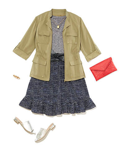 A playful skirt can transform a grounded cargo button down to give it a flirty and feminine feel.