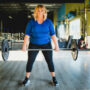 Plus size woman looking at her body in the mirror while wearing an active top and shorts.