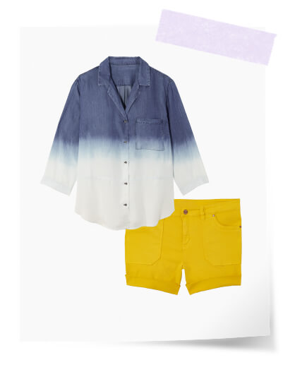 Let blue skies and sunrays inspire your look—layer a dip-dyed button-up over a white tee and step into bright-yellow shorts. Bring the same shades into your accessories.